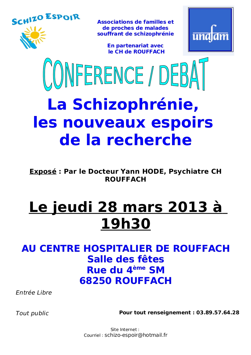 Le 28 mars 2013: conférence/débat avec le Dr Yann Hodé au CH Rouffach "la schizophrénie, les nouveaux espoirs de la recherche" télécharger ici l'affiche